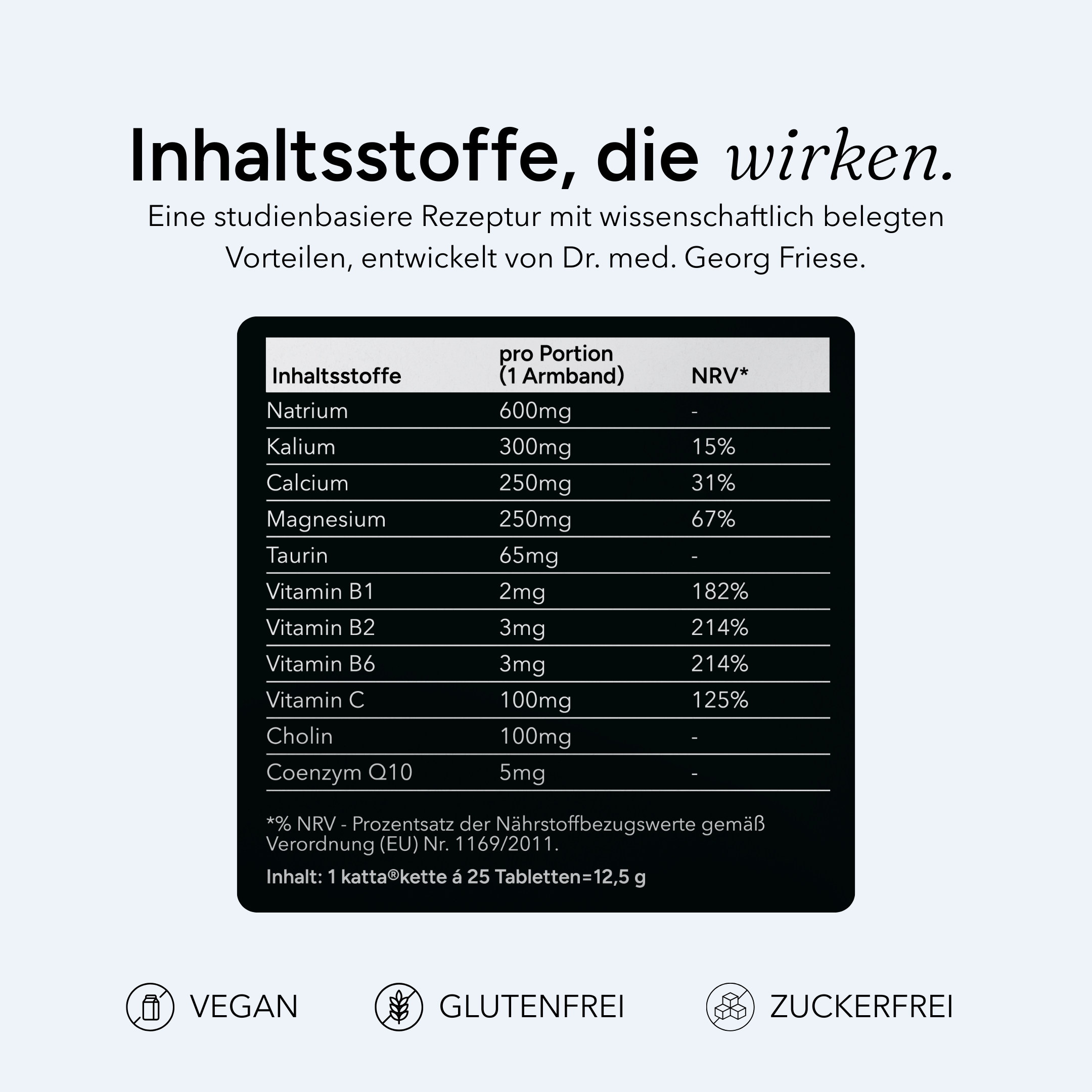 Die katta®kette ist auf den tatsächlichen Nährstoffverlust durch Alkohol und starkes Schwitzen abgestimmt. Die Entwicklung basiert unter anderem auf der Auswertung einer Metastudie mit Blutgasanalysen vor und nach Alkoholkonsum.