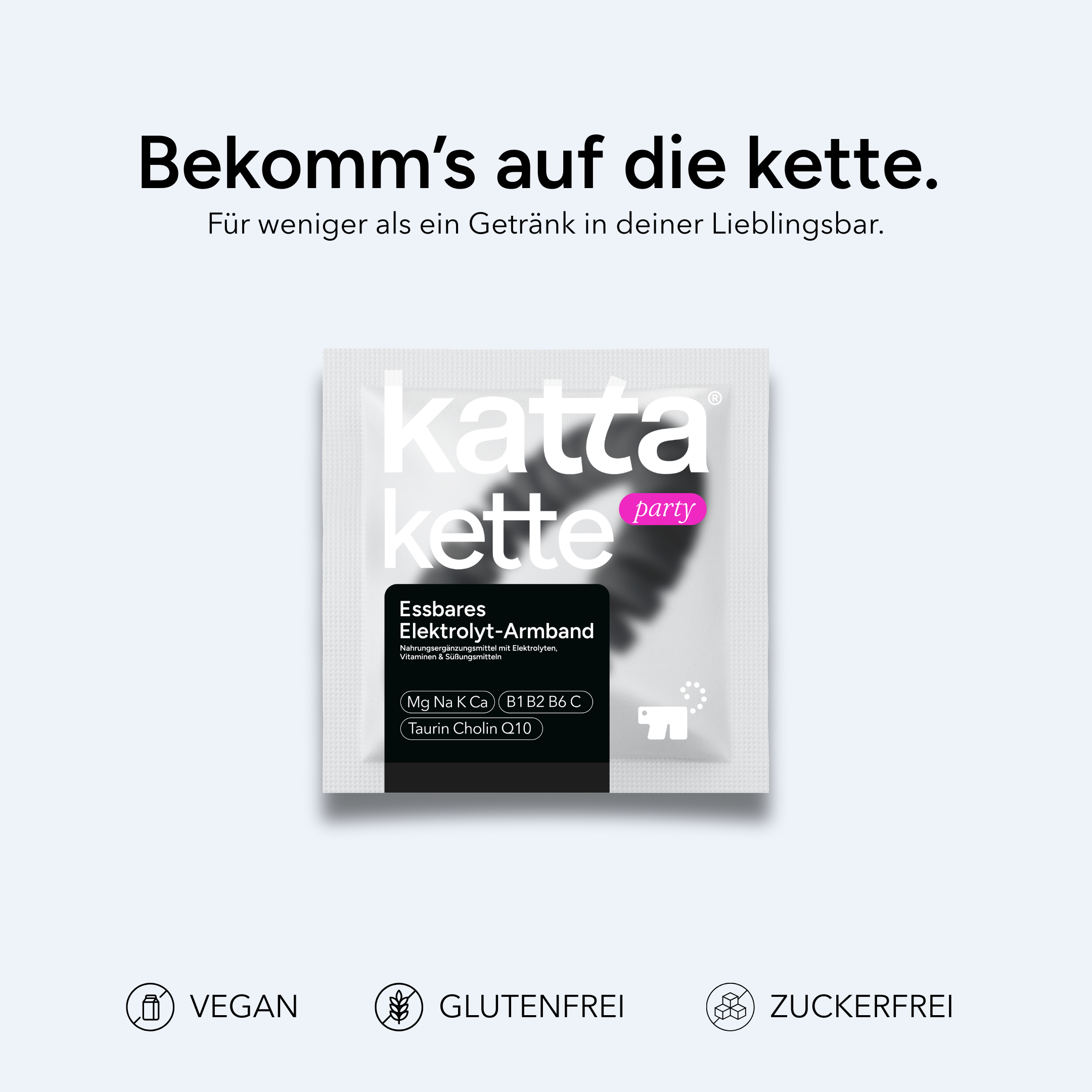 Mit der katta®kette haben wir die erste, echte Alternative im Elektrolyt-Markt geschaffen. Statt unpraktischer Pulver oder Brausetabletten bekommst du eine Lösung, die sich nahtlos in deine Party einfügt.